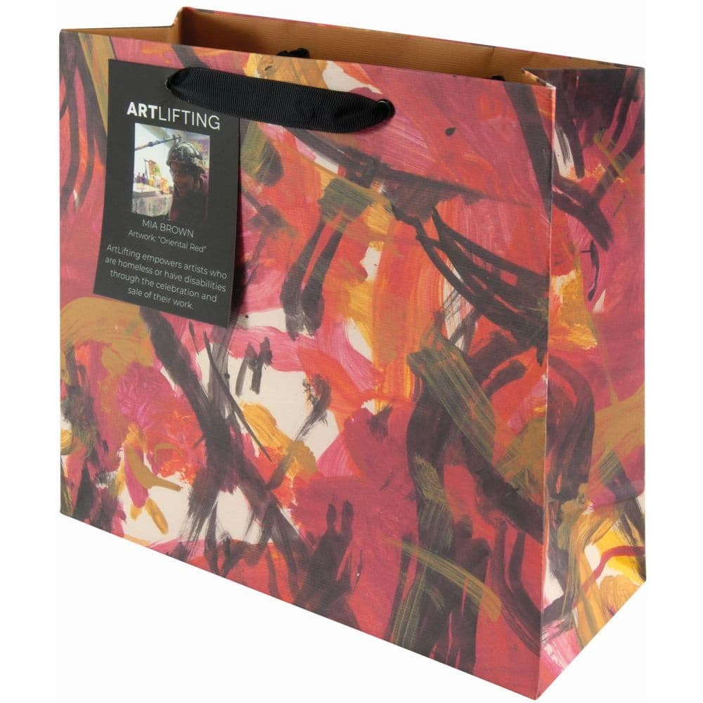 Elevate your gift-giving experience with the ArtLifting Oriental Red Medium Square Gift Bag, featuring the exclusive artwork 'Oriental Red' by Mia Brown. This medium-sized gift bag, measuring 9.75 inches by 9.75 inches by 4 inches, is crafted from ribbed white kraft paper and includes sturdy grosgrain ribbon handles for a touch of elegance. Each bag showcases a vibrant, abstract design that not only enhances your gift but also supports a noble cause, empowering artists who are homeless or have disabilities.