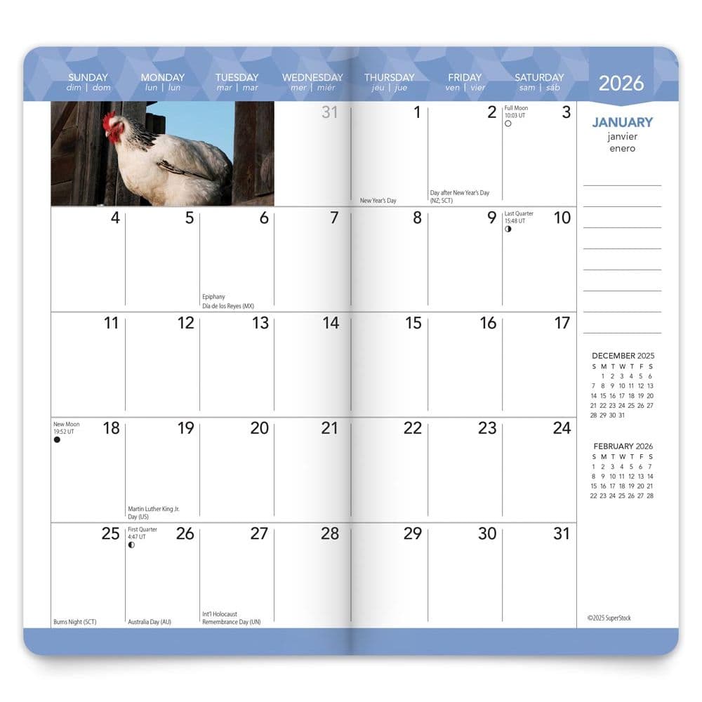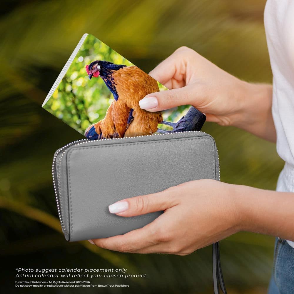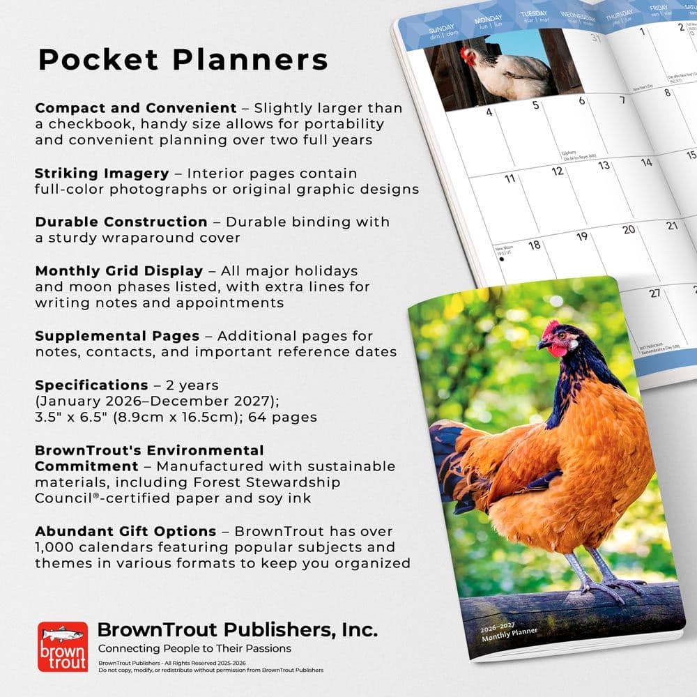 Chickens are said to be the closest living relative of the T-Rex, and that's just one of many reasons to find them fascinating. They're beautiful to look at, with their colorful feathers and bright combs?and they're smart! Baby chicks communicate with their mothers while still in their eggs, and once grown, chickens can recognize faces and teach each other how to survive and behave. They're fun to watch, as they love to run, jump, and play. Enjoy lovely photographs of these charming, intelligent birds in this Chickens calendar.