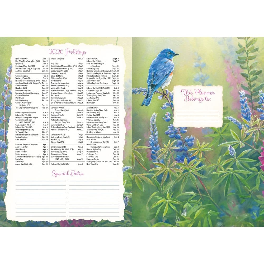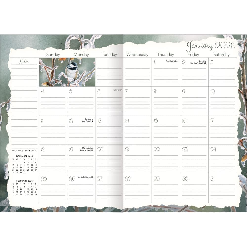 • Features monthly artwork of colorful songbirds by renowned artist Susan Bourdet, enhancing your planning with a touch of nature's charm.