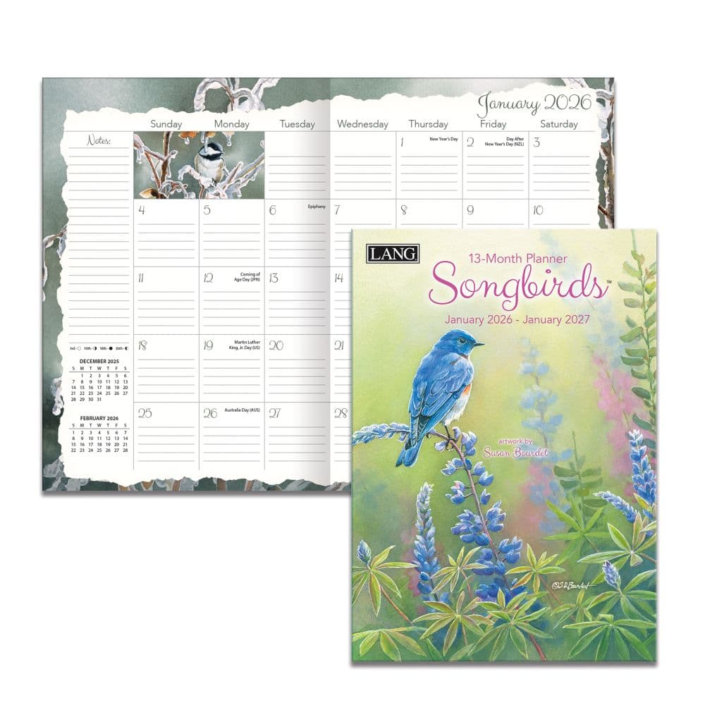 The 2026 Songbirds Monthly Planner by The LANG Companies, adorned with Susan Bourdet's vibrant and cheerful bird artwork, is your perfect companion for staying organized and inspired throughout the year. This 13-month planner spans from January 2026 to January 2027, offering a harmonious blend of functionality and beauty, ideal for bird lovers and art enthusiasts alike.