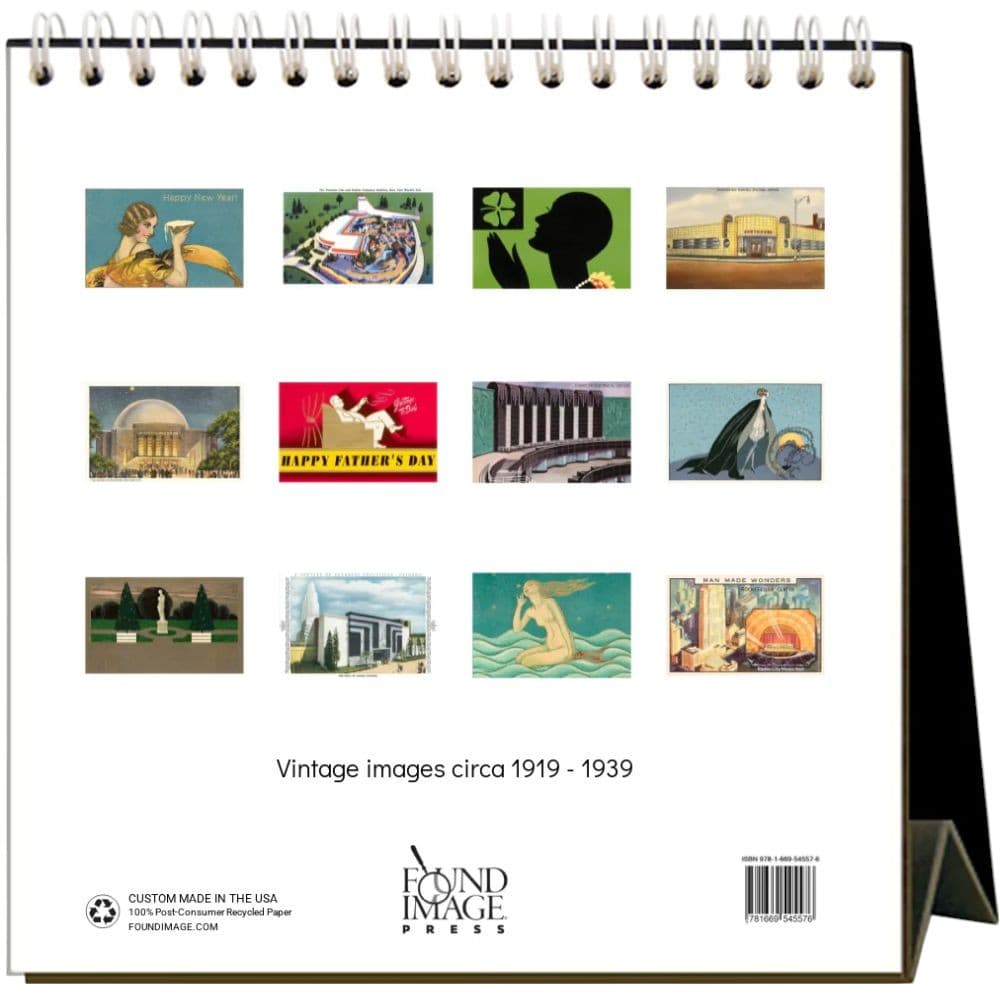Do you love the curves, forms, and colors of the Art Deco era? Do you just love good design? This Art Deco easel desk calendar is for you. It features 12 vintage images (1919 - 1939) of classic Art Deco graphics, gardens, and architecture.Printed on 100% post-consumer recycled, acid-free, natural white, heavy cardstock, it measures 6 x 7 x 3when expanded. Made in the USA!
