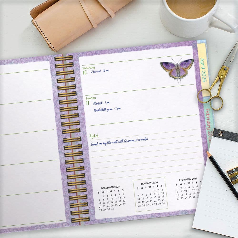 The WSBL Butterflies 2026 File-it Planner is a planner and filing system all in one! Record your engagements on the calendar grid and store your documents in the built-in, perforated file folder for each month. Features artwork by Jane Shasky.