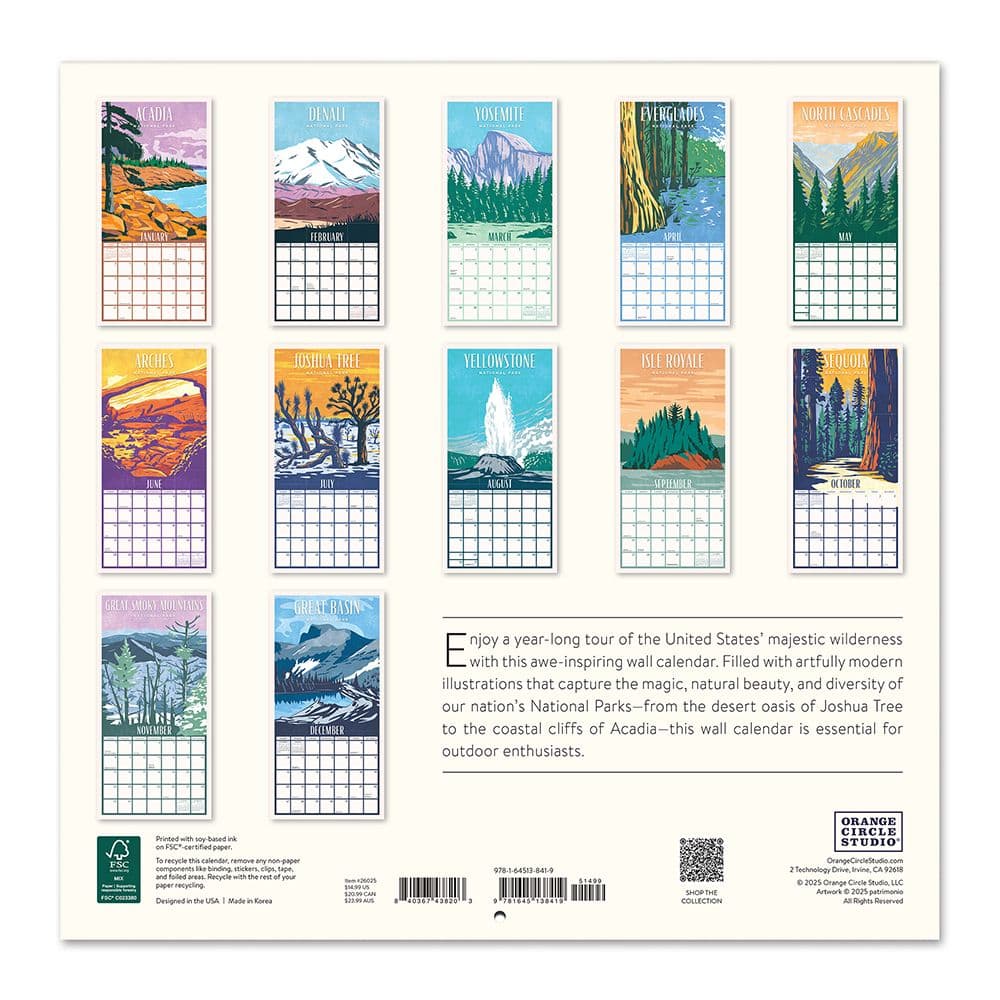Celebrate the majestic landscapes of America's National Parks with the 2026 National Parks Wall Calendar from Orange Circle Studio. Perfect for nature lovers and outdoor enthusiasts, this calendar features beautifully illustrated scenes of various national parks, making it a stunning addition to any room. Printed on FSC-certified paper with eco-friendly soy-based inks, it not only serves as a practical planner but also supports environmental sustainability and the artistic community.