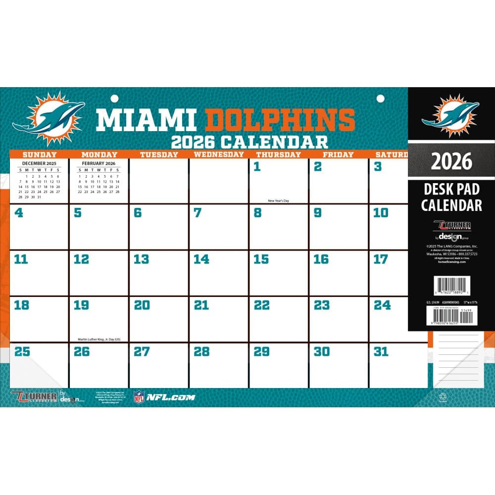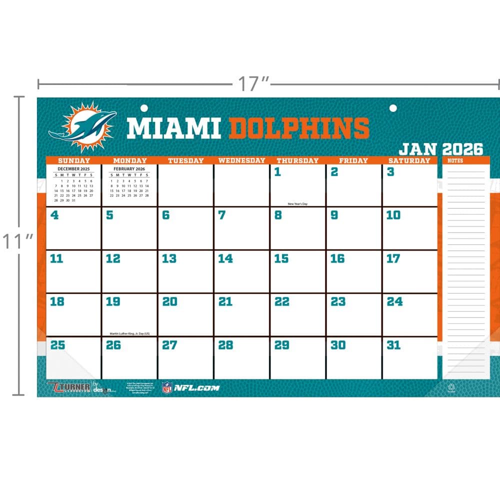Stay organized and show your team spirit with the 2026 Miami Dolphins NFL Desk Pad Calendar, 17" x 11". This officially licensed desk pad calendar by Turner Licensing is the perfect way to keep track of important dates while supporting your favorite NFL team. Ideal for any home, office, or sports den, this calendar features a full 12-month layout from January to December 2026 with medium-sized grid spaces for easy scheduling.