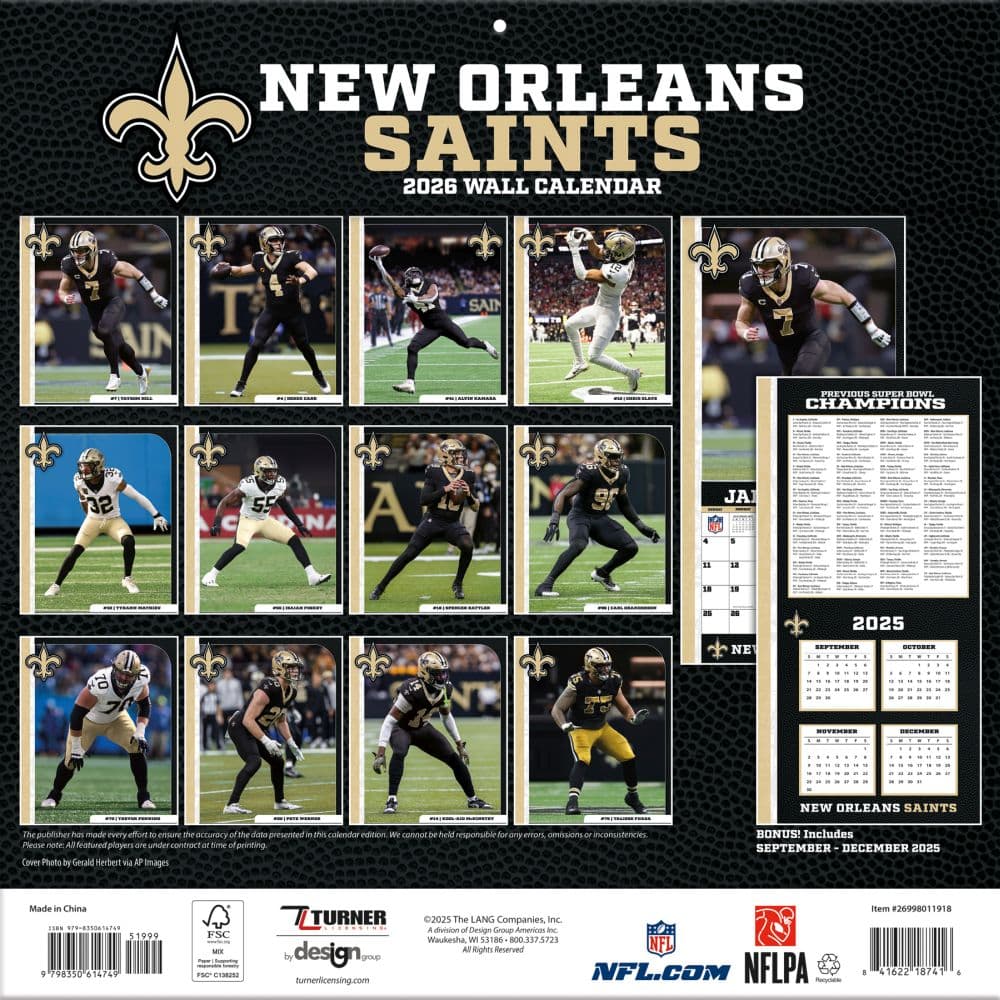 Made for passionate football fans, this team wall calendar includes poster-sized action shots of your favorite players from the New Orleans Saints every month! Each month also includes professional athlete bios and new graphics featuring the Saints team colors and logos. Made with exceptional quality, the 12x12 calendar also includes bonus pages that feature Sept. - Dec. 2025 and the past Super Bowl results! 12-month format (January - December 2026). Dimensions: 12"w x 24"h (opened).