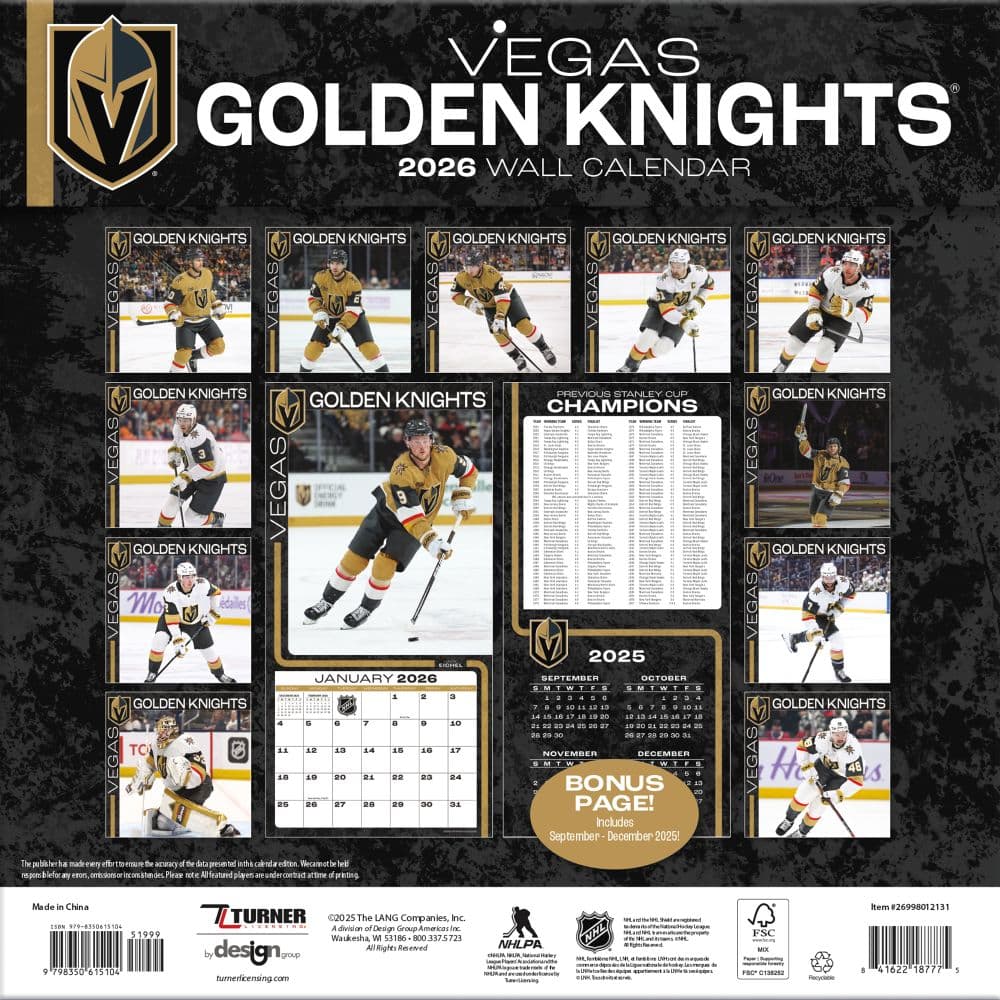 This wall calendar is a must-have for any die-hard Vegas Golden Knights fan! Made for passionate hockey fans, the Vegas Golden Knights Wall Calendar includes poster-sized action shots of your favorite players from the team in stunning, full-color photos! Each month also includes professional athlete bios and visually appealing graphics featuring team colors and logos. Made with exceptional quality, the 12x12 calendar also includes bonus pages that feature Sept. - Dec. 2025 and the past Stanley Cup Final results! 12-month format (January - December 2026) Dimensions: 12"w x 24"h (opened).
